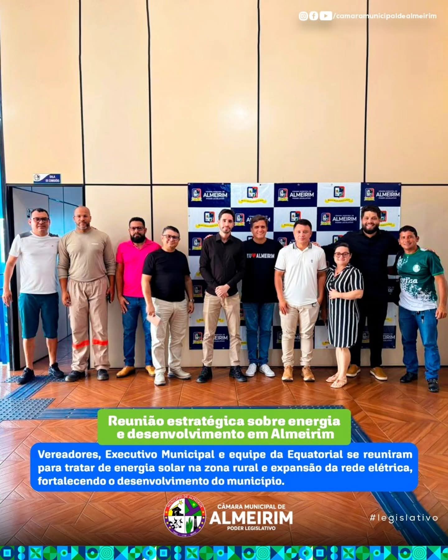 A Câmara Municipal de Almeirim realizou uma importante reunião institucional reunindo vereadores, o Poder Executivo — representado pela prefeita Lúcia do Líder e pelo secretário Wallace — e a equipe da Equatorial. O encontro teve como pauta temas fundamentais para o desenvolvimento do município, com destaque para a implantação de placas solares na zona rural e a expansão da rede elétrica, visando melhorar o acesso à energia e a qualidade de vida da população. A iniciativa reforça a importância do diálogo e da parceria entre os poderes e instituições, buscando soluções concretas para as demandas da nossa cidade. Seguimos trabalhando com compromisso e responsabilidade por uma Almeirim cada vez melhor!