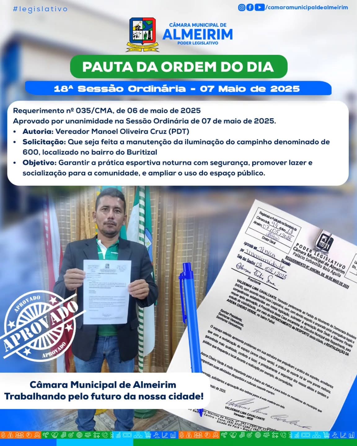💡⚽ Mais iluminação, mais segurança e lazer! O vereador Manoel Oliveira Cruz (PDT) apresentou o Requerimento Nº 035/2025, solicitando à Prefeitura de Almeirim a manutenção da iluminação do campinho 600, localizado no bairro do Buritizal. A proposta visa garantir melhores condições para a prática esportiva noturna, além de valorizar o espaço de lazer e promover mais segurança para a comunidade. Aprovado por unanimidade! ✅ #CâmaraDeAlmeirim #VereadorManoelCruz #Campinho600 #Buritizal #EsporteELazer #TrabalhoPeloPovo